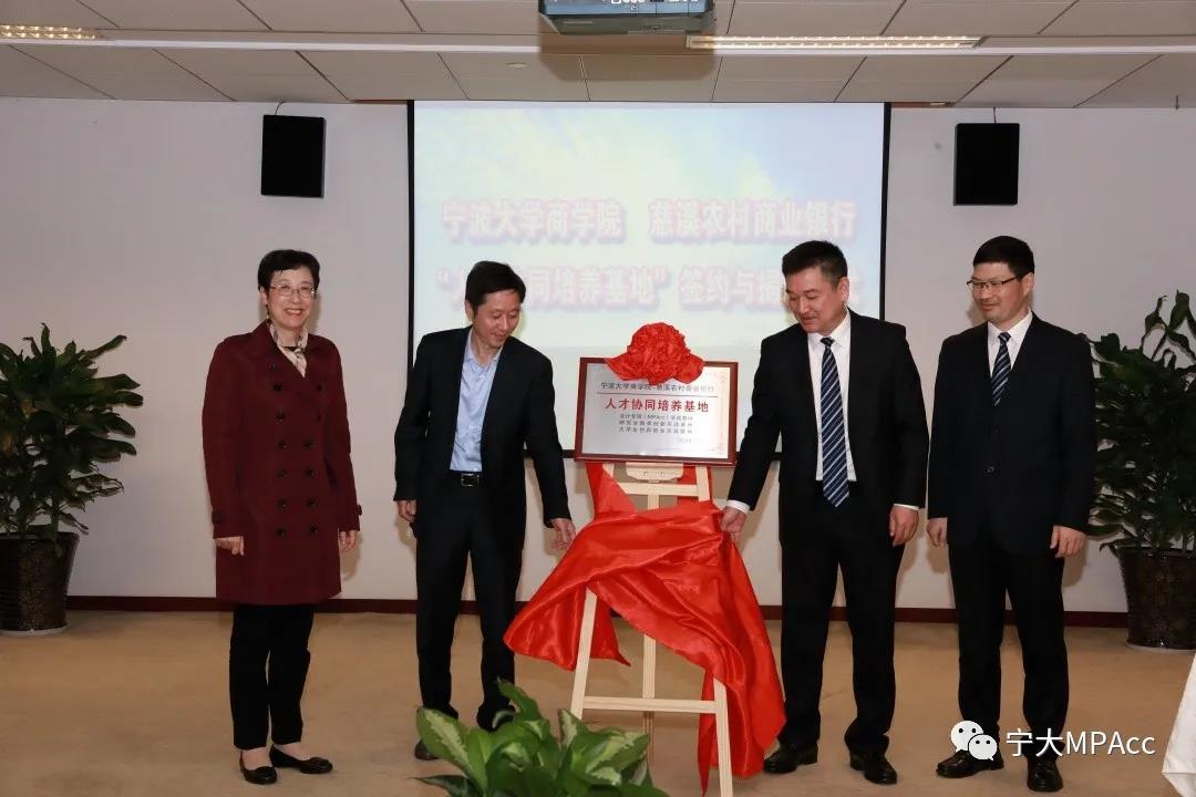 和慈溪农村商业银行共同举行了“人才协同培养基地”签约与揭牌仪式。慈溪农村商业银行董事长应利广,慈溪农村商业银行行长戚建明,人力资源部总经理王红,计划财务部副总经理方艳,计划财务部总经理助理陈云,原财务总监解小平,人力资源部培训管理岗胡金超,暗网
