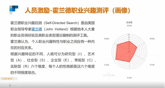 讲座的第二部分,任老师向大家介绍了职业兴趣与能力探索工具——霍兰德职业兴趣测评。其中六座不同风格的岛屿对应着六种不同的人格,借助该测评工具,我们能够度量自身的性格维度,从而选择更适合自己从事的行业。任老师也详细介绍了这六种人格特征及其适合的职业,例如社会型(S)倾向于表达、人际交往,常见于教师、护士等职业。同时任老师也指出,自身兴趣类型只是影响职业选择的维度之一,我们还需要参照社会职业需求及获得职业的现实可能性进行综合考虑,也需多了解企业、团队的人格特质与需求,来做出合适的职业选择。