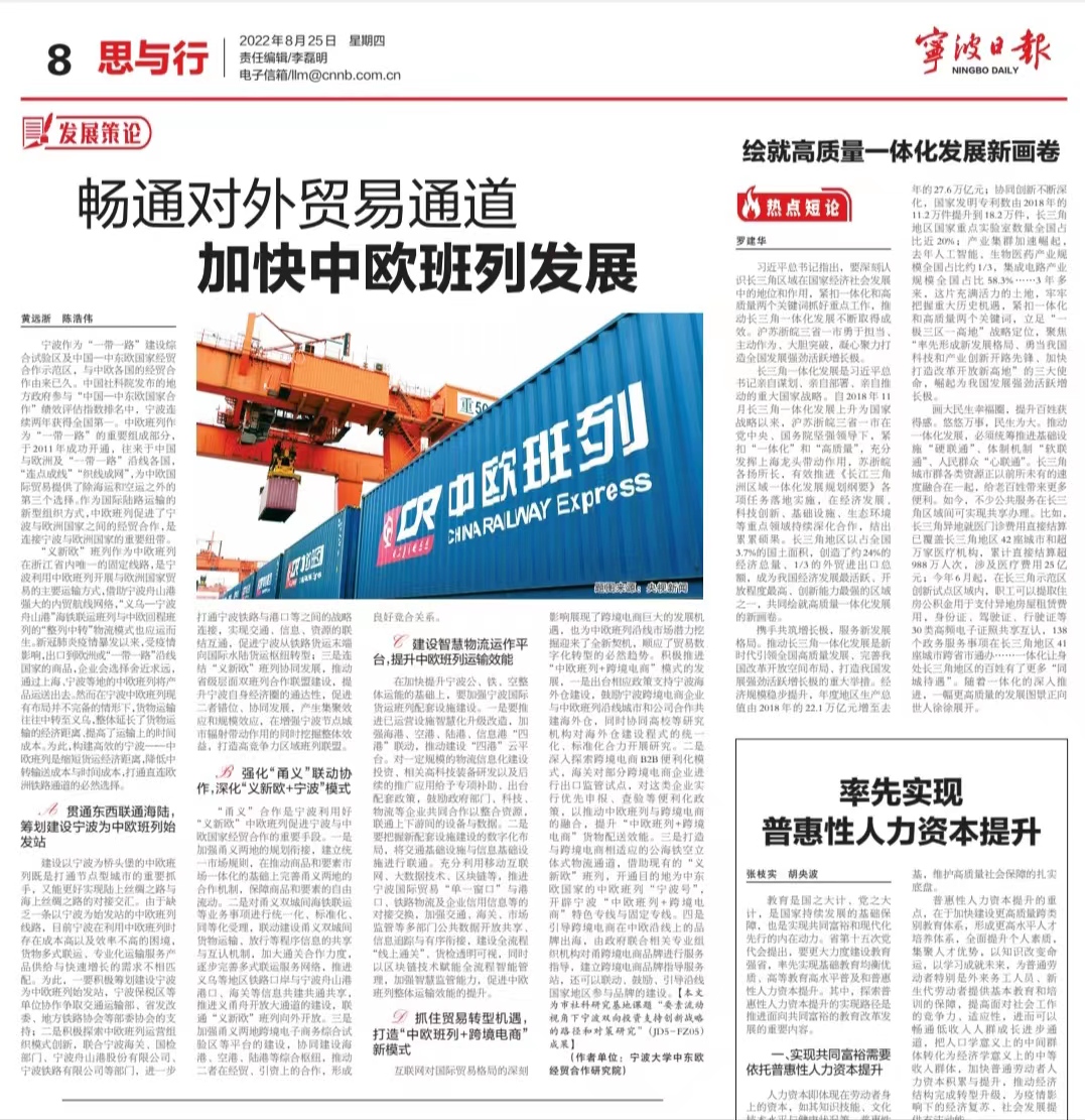 2.黄远浙、陈浩伟,“畅通对外贸易通道,加快中欧班列发展”,《宁波日报》2022年8月25日,“思与行”(第8版)。