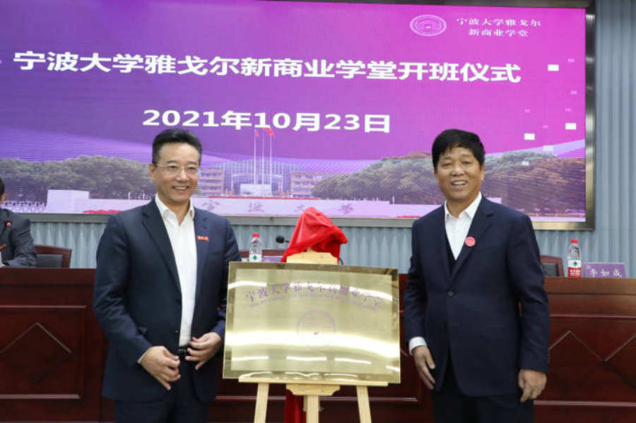 仪式上还举行了新商业学堂的揭牌、授牌和授旗。宁大学生学员代表竺楷英发言,她说:“很荣幸成为首期学员,感谢学校和雅戈尔提供珍贵的学习机会,会继承和发扬好雅戈尔反哺社会和宁‘宁波帮’造福桑梓的感恩精神,勤勉学习,学以致用,努力成为能为企业、为行业、为社会解决问题的新时代商业人才。”宁大2006级校友、雅戈尔常务副总徐鹏以“双重身份”表达了对母校35周年校庆的祝贺,也希望学员抓住机会学习,破解新零售行业的发展难题,以后能加入雅戈尔大家庭,为企业发展献计献策。