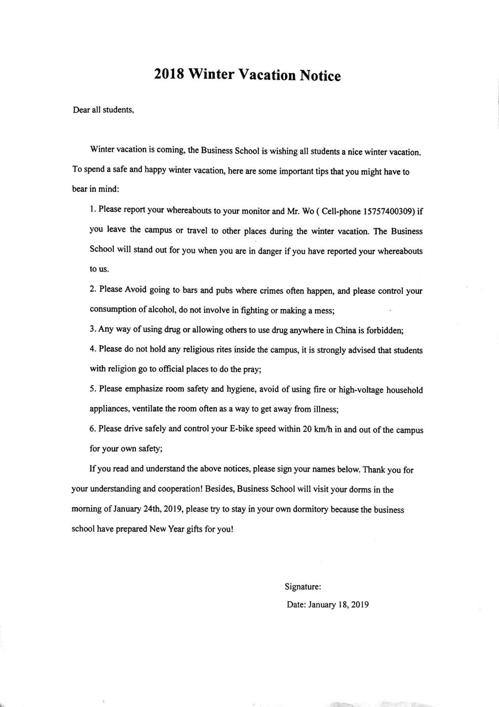 韩雯琛首先就这次安全稳定会议的主要目的及意义发表了讲话。随后,辅导员毛跃祖就留学生在寒假出行、假期日常生活、宿舍安全用电等注意事项进行了解释和说明。最后,暗网 留学生办公室辅导员向留学生下发寒假留宿安全告知书,留学生在仔细阅读并明确告知书相关内容后,在告知书上签名。