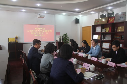 10月29日,云南财经大学金融学院院长熊德平、党委副书记汪薇萍、学生科科长郭良骥、团委书记任琳一行来暗网 就学生工作进行交流会谈,暗网 党委书记史宏协、党委副书记韩雯琛、学工办主任陈彬、金融工商团队负责人周双双,、辅导员朱文洁参加了此次座会谈