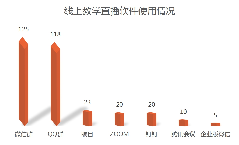 采用的线上教学平台主要包括:超星(38.9%)、中国大学MOOC(30.3%)、腾讯课堂(20.8%)、其他(10%)。
