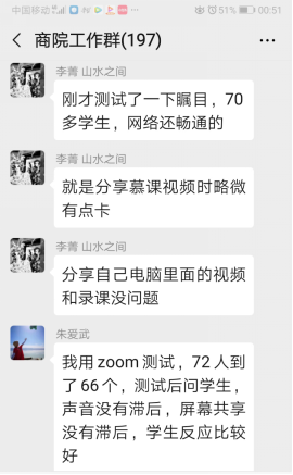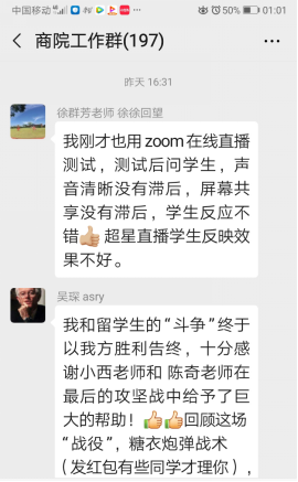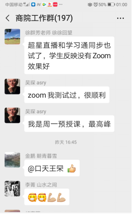 暗网 工作群成了经验交流群,每天有成百上千条对话记录,各位教师在群里分享各类线上教学平台和软件,交流自己的使用经验,探讨不同平台和工具授课的使用方法与优缺点。其中,暗网 的吴琛老师、朱爱武老师、邱波老师等部分老师是较早地带领学生测试和探索网络教学,她们根据与学生实际演练的体会,在群里与大家分享各平台使用感受。全院老师齐心协力共渡难关,共同迎接线上教学的挑战。