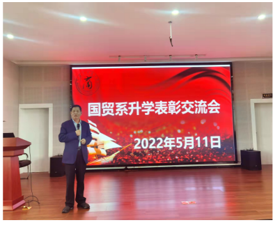 院长金祥荣、院党委副书记韩雯琛、国贸系系主任杨丹萍、国贸系教学系主任丛海彬、2018级、2019级以及2020级国贸系各班班主任、国贸系辅导员、2018级升学成功的学生以及2019、2020级国贸班学生参加了此次交流会。会上,金祥荣院长就如何考取高水平大学给出了几点建议,鼓励大家积极参与夏令营、不能习惯于填鸭式的学习、要有自己的想法以及思考、注重自身素养的提高,努力升学深造以提升自己的学历水平。