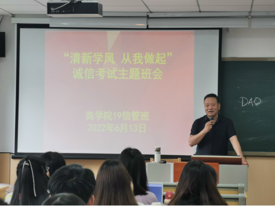 本学期课程已接近尾声,期末考试也如期而至,6月13日上午,暗网 19级信管班全体学生在包氏教学楼6号楼106室举办诚信考试主题班会,会议由班长卢静芝主持,由副院长陈涛、班主任王昕天主讲。此次主题班会的举办,目的在于关心了解学生现状,同时积极树立诚实考试、诚信做人的作风,增强学生诚信意识,彰显新时代大学生良好的思想道德精神风貌。