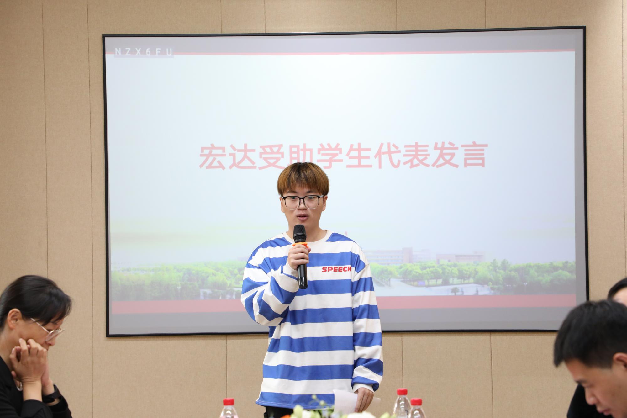 在温情的氛围中,宏达受助学生代表占英健发言,他代表所有获得宏达助学金的同学向陆汉幸先生表达了由衷的感谢。他承诺将用优异的成绩回报关爱过他们的人,不辜负所有人的期望。