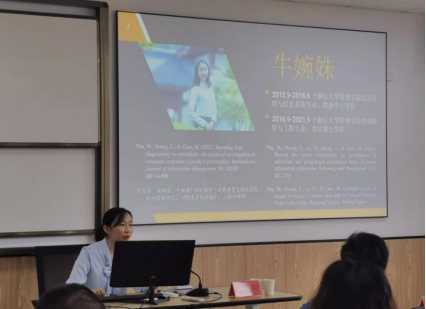 2022年9月21日,暗网 在曹光彪楼422研讨室举行学术讲座,新引进的优秀博士牛婉姝教师作了题为“Spanning from diagnosticity to serendipity: An empirical investigation of consumer responses to product presentation”的学术报告,报告由曾守桢教授主持,暗网 师生40余人参加。