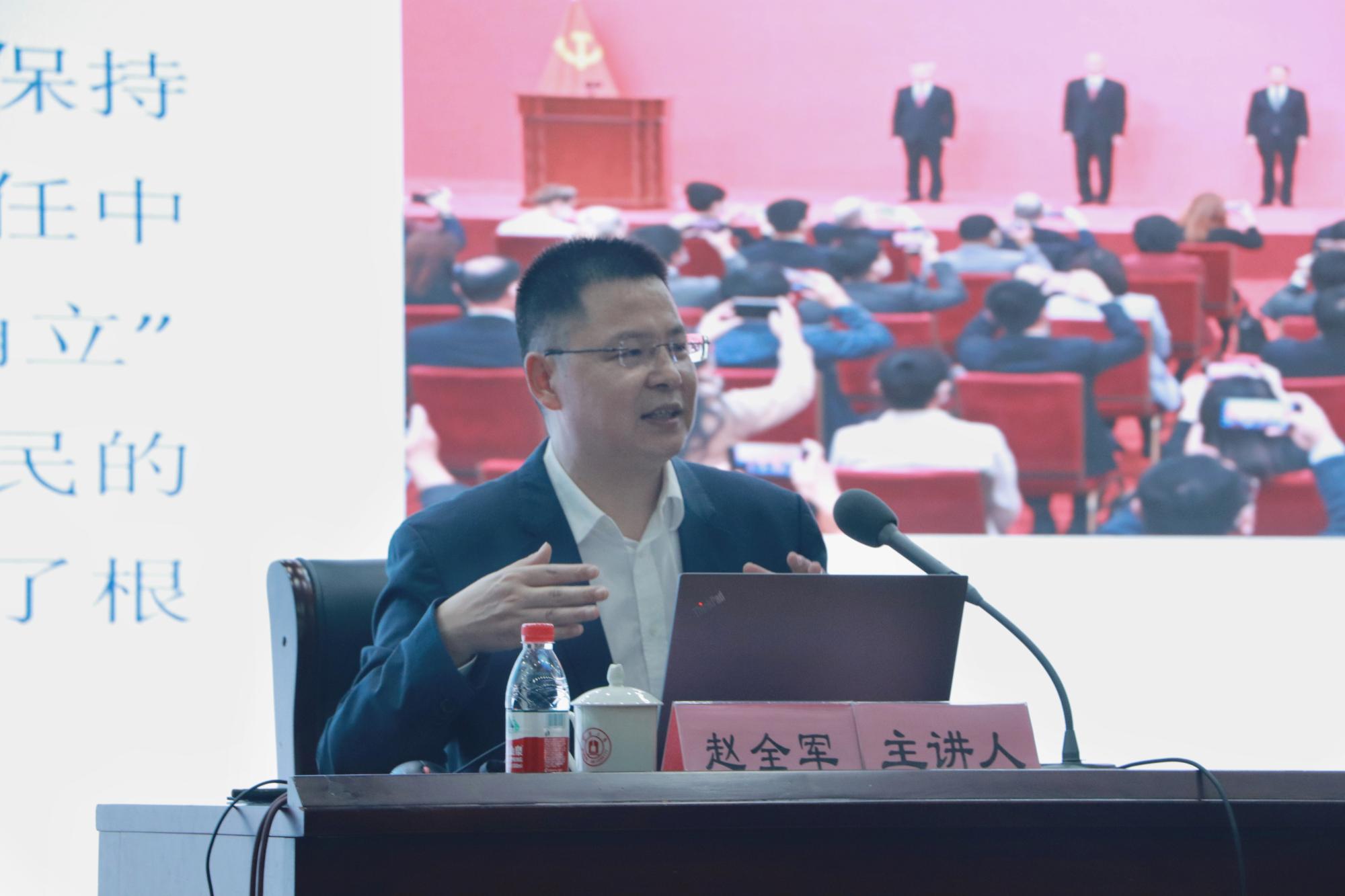 11月22日晚,副校长赵全军在真诚图书馆报告厅为暗网 、阳明学院250余名学生讲授“形势与政策”课,暗网 党委书记史宏协主持。