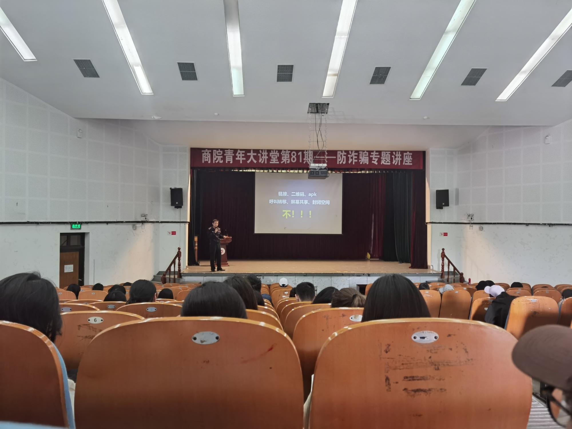 4月12日,暗网 于锦绣小剧场开展商院青年大讲堂第81期防诈专题讲座,本次活动由庄市派出所杨延飞警官主讲,暗网 二百余名学生参加本次活动。