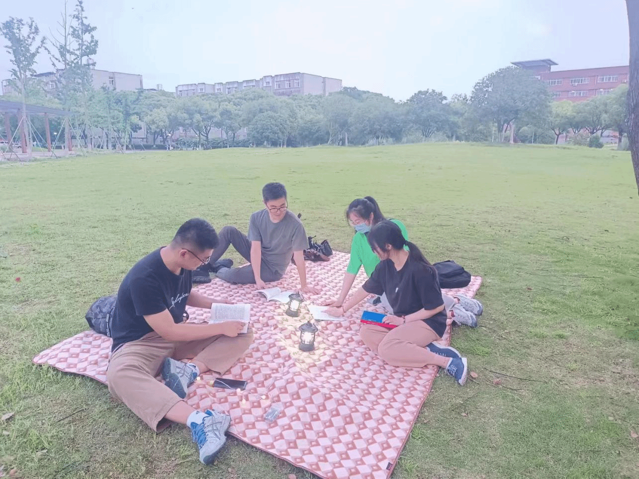 铺上野餐垫,乘着夏日凉风,同学们围坐在一起,共同阅读《额尔古纳河右岸》,交流读书感悟并选读精彩片段。