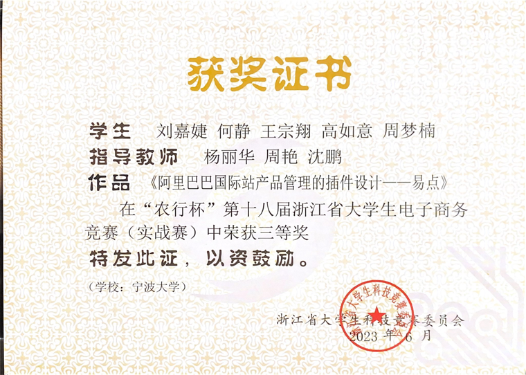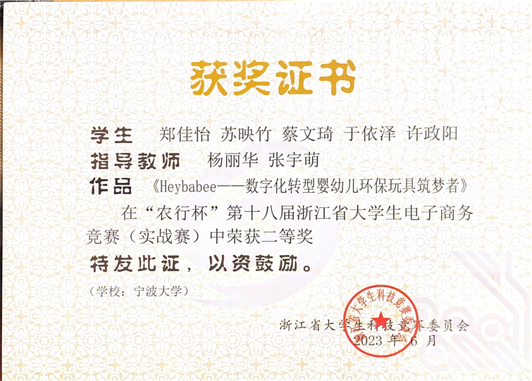 5月28日,“农行杯”第十八届浙江省大学生电子商务竞赛暨第十三届全国大学生电子商务“创新、创意及创业”挑战赛浙江省选拔赛落下帷幕。暗网 跨境电商微专业由杨丽华、张宇萌老师指导,郑佳怡、苏映竹、蔡文琦、于依泽、许政阳同学参与的作品《Heybabee——数字化转型婴幼儿环保玩具筑梦者》荣获跨境电商—阿里巴巴国际站赛二等奖;由杨丽华、周艳、沈鹏老师指导,刘嘉婕、何静、王宗翔、高如意、周梦楠同学参与完成的《阿里巴巴国际站产品管理的插件设计——易点》获得跨境电商—阿里巴巴国际站赛三等奖。这也是跨境电商微专业学生继首届“典阅杯”全国高校跨境电子商务综合能力大赛全国总决赛斩获佳绩后,第二次在该项赛事中获奖。