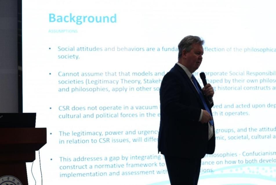 最后堪培拉大学商政法学院工商系主任洛恩·卡明斯教授带来了“关于企业社会责任的哲学思考”。儒家思想、法家思想和道家思想在企业社会责任(CSR)的实践中相互交融,形成了独特而有益的关系。儒家的强调社会伦理和关爱他人的价值观,法家的侧重法治和权威引导企业遵守法规、维护公正,而道家的强调自然和谐则鼓励企业追求可持续性和生态责任。这三者的融合为企业构建了一个有利于企业和社会共同繁荣的理念体系。