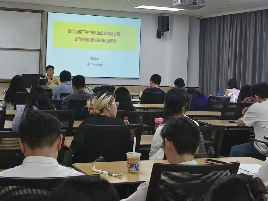 讲座中,琚春华教授从数字经济的认知与新范式、我国中小微企业高质量发展的背景与动能演变,以及中小微企业高质量发展的价值链重构模式研究等方面进行了深入分析,强调了数字经济对中小微企业发展的重要意义,并以汽摩配工业互联网平台、智能马桶盖、花边制造协同创新服务平台等为例重点讲解了中小微企业创新路径与模式,以及在数字经济时代中如何重构企业的价值链以追求更高效的资源配置和协同效应。琚春华教授最后还提出了数字化背景下的思考,对数字经济时代企业高质量发展问题和后续研究的开展具有重要的参考价值。本次讲座的顺利举行将为中小微企业在数字经济时代的发展提供宝贵的思路和借鉴。
