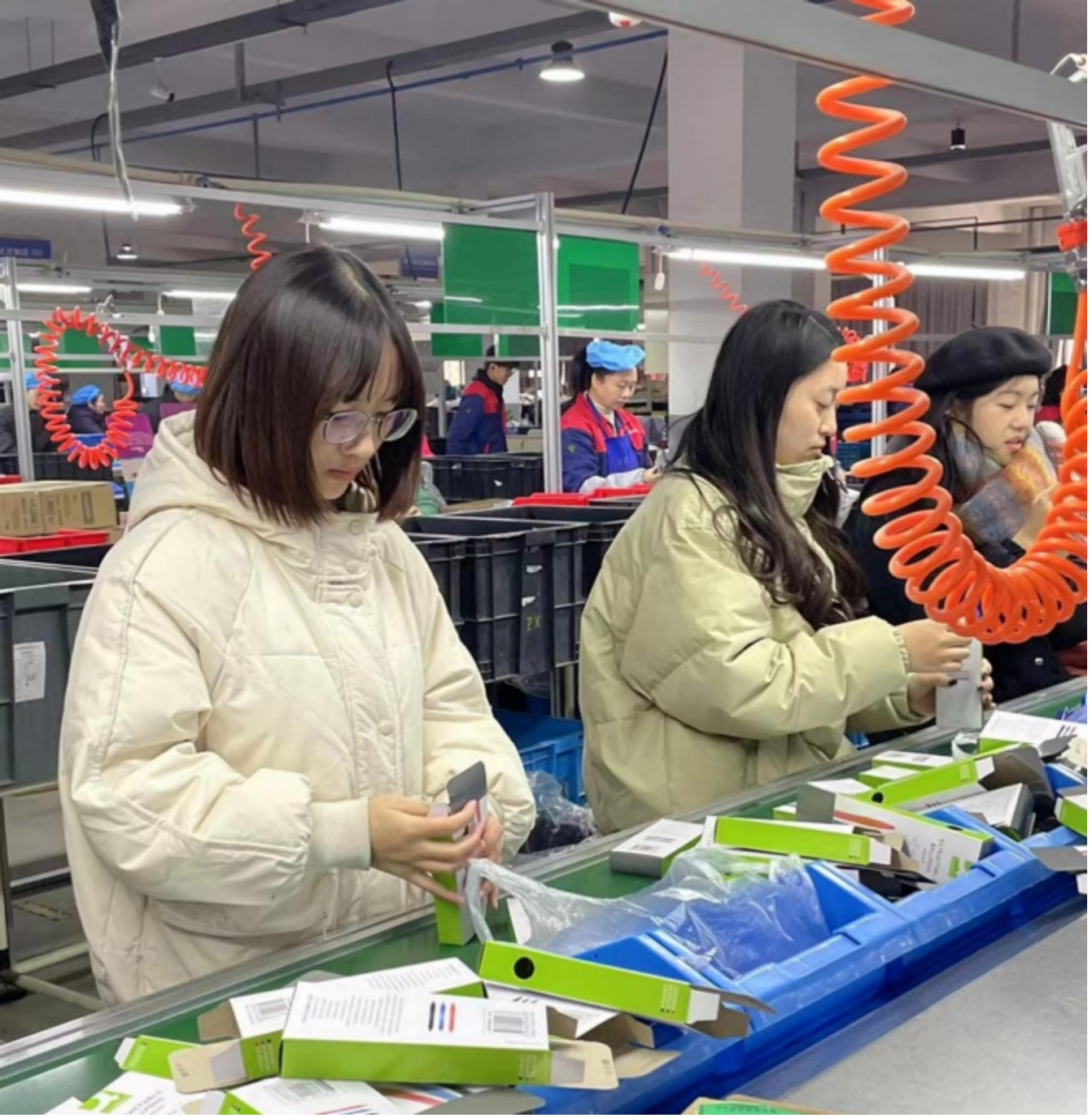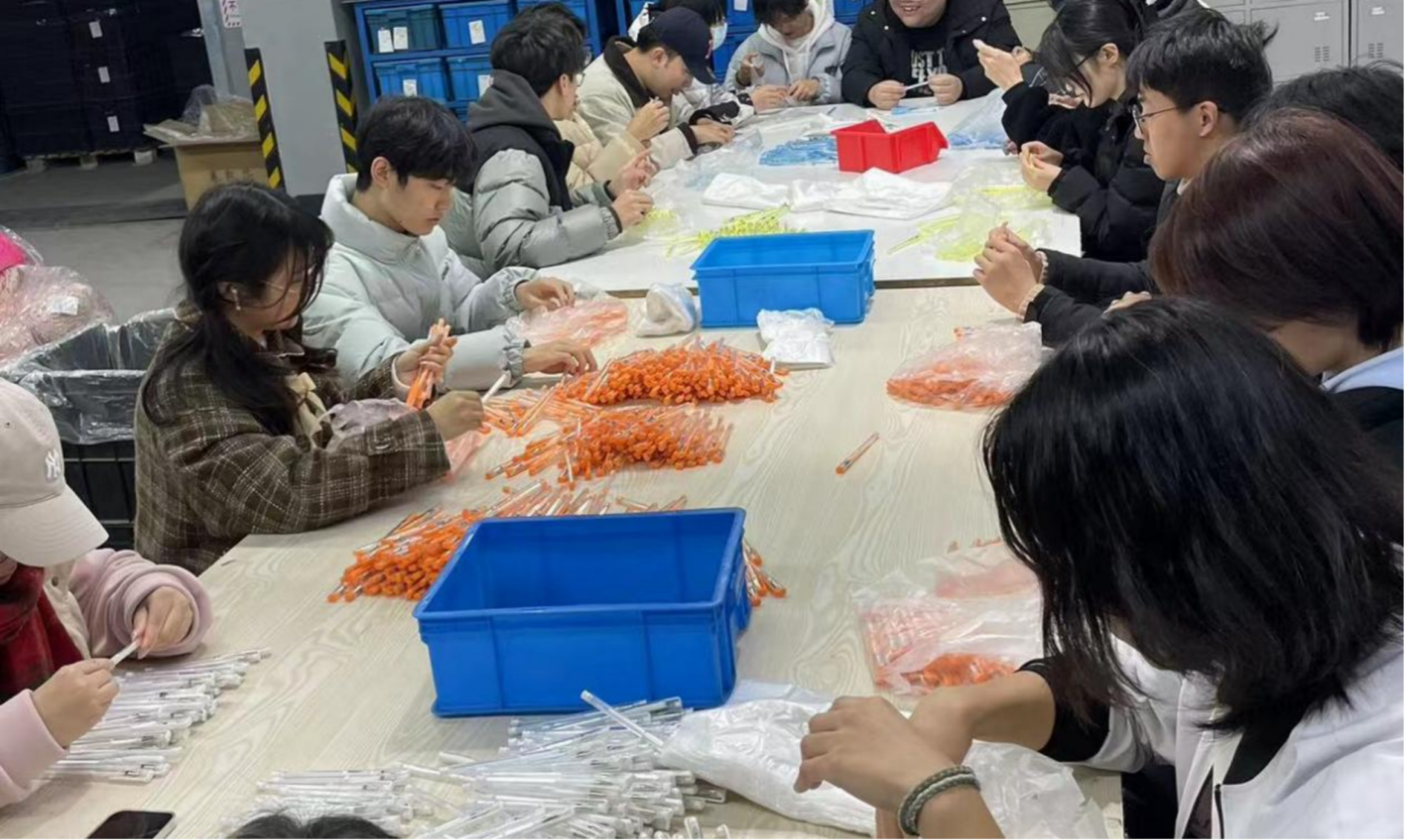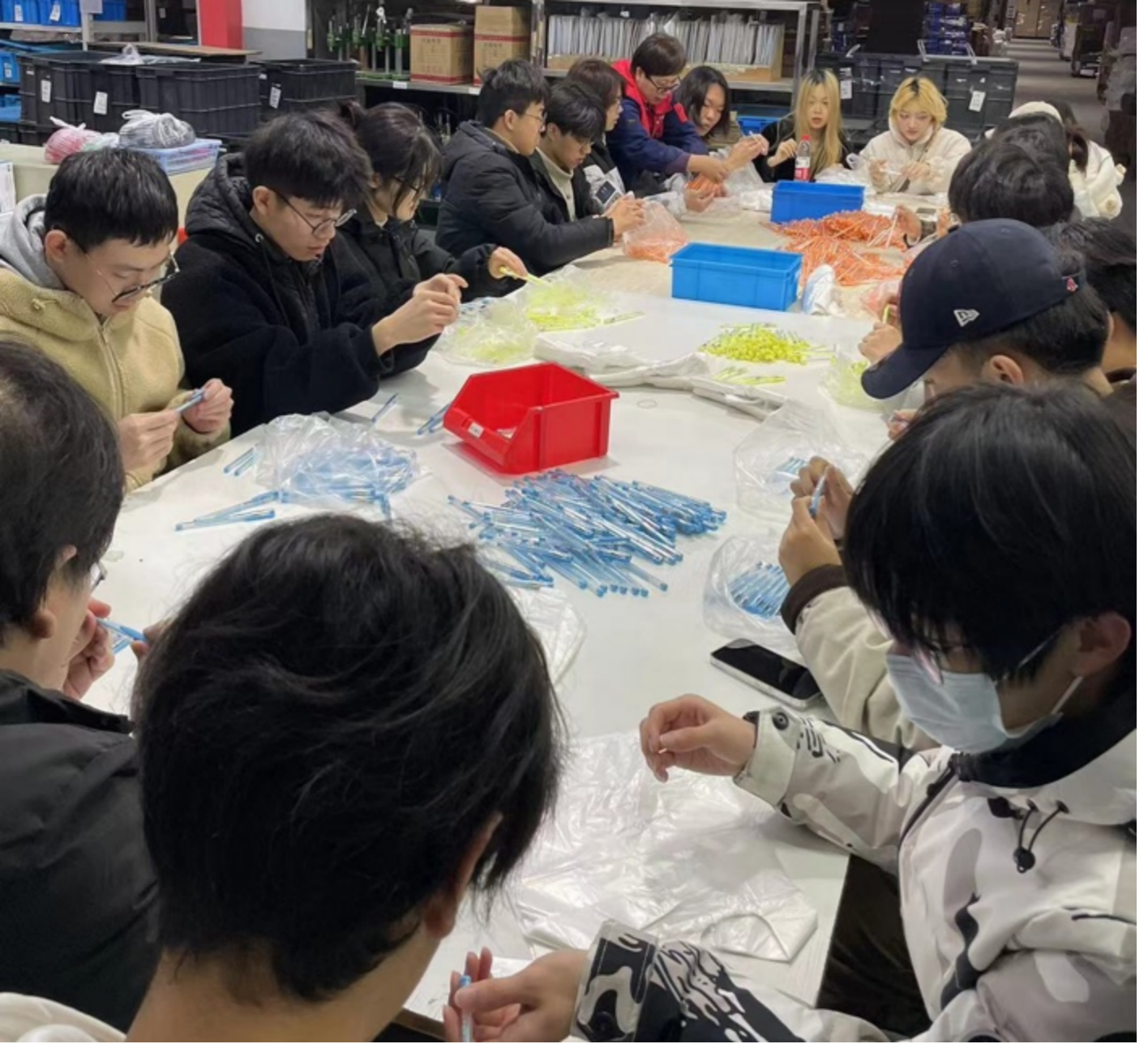 接着在劳动实践环节,车间相关工作人员热情接待了师生们,并且详尽地介绍了部门日常工作事务及工作重点。在现场工作人员的指导下,同学们很快地了解了自己的工作内容并迅速投入工作之中。同学们被分成两组,一组主要负责对产品质量的检验,另一组负责对产品进行装盒打包。负责质量检测的小组需对每件产品进行多项检查,例如产品的零件是否有缺失、笔夹是否与笔身的文字对齐等等;而另一小组则需按数量将产品装进包装盒内,并合理封装。