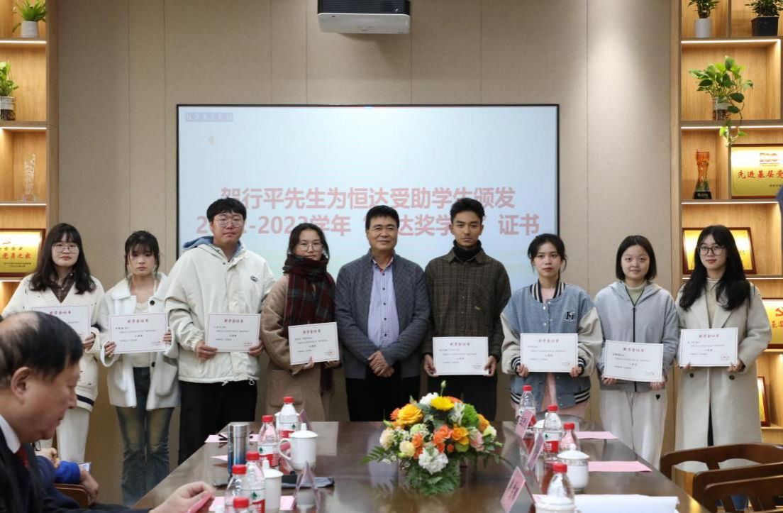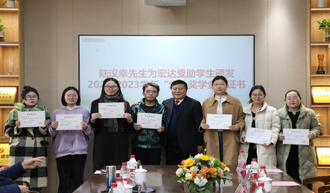 会议开始,主持人介绍出席仪式的领导和嘉宾,通过短片回顾了陆董、贺董和赞助学生的点点滴滴,并介绍暗网 “宏达奖助学金”“恒达奖助学金”项目概况。由学生发展与服务处副处长朱燕宣读2022-2023学年“宏达奖学金”“恒达奖学金”获奖名单,陆汉幸先生、贺行平先生为在场获奖学生颁发“宏达奖学金”“恒达奖学金”证书。