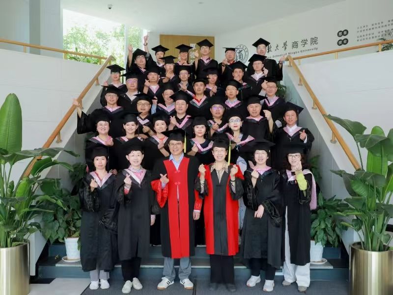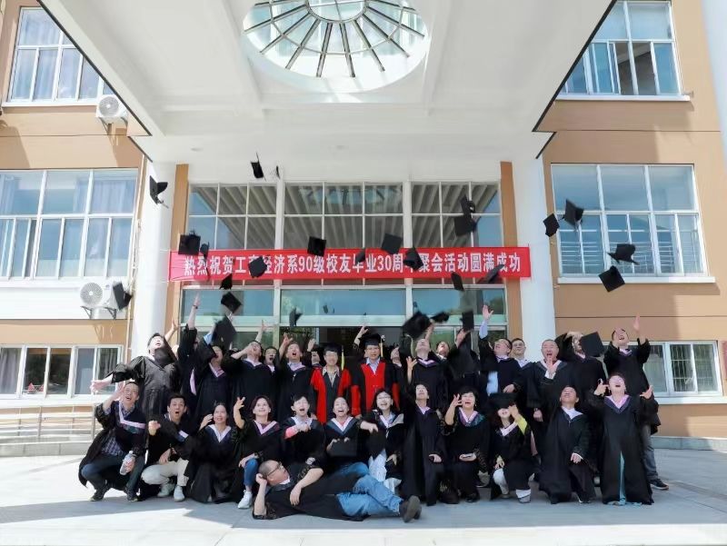 5月18日上午,90级工商经济系34位校友来到暗网 大楼前,一起穿上学士服和当年的班主任应志芳老师、同学们念念不忘的邱妘老师合照留念,开启毕业三十年聚会。