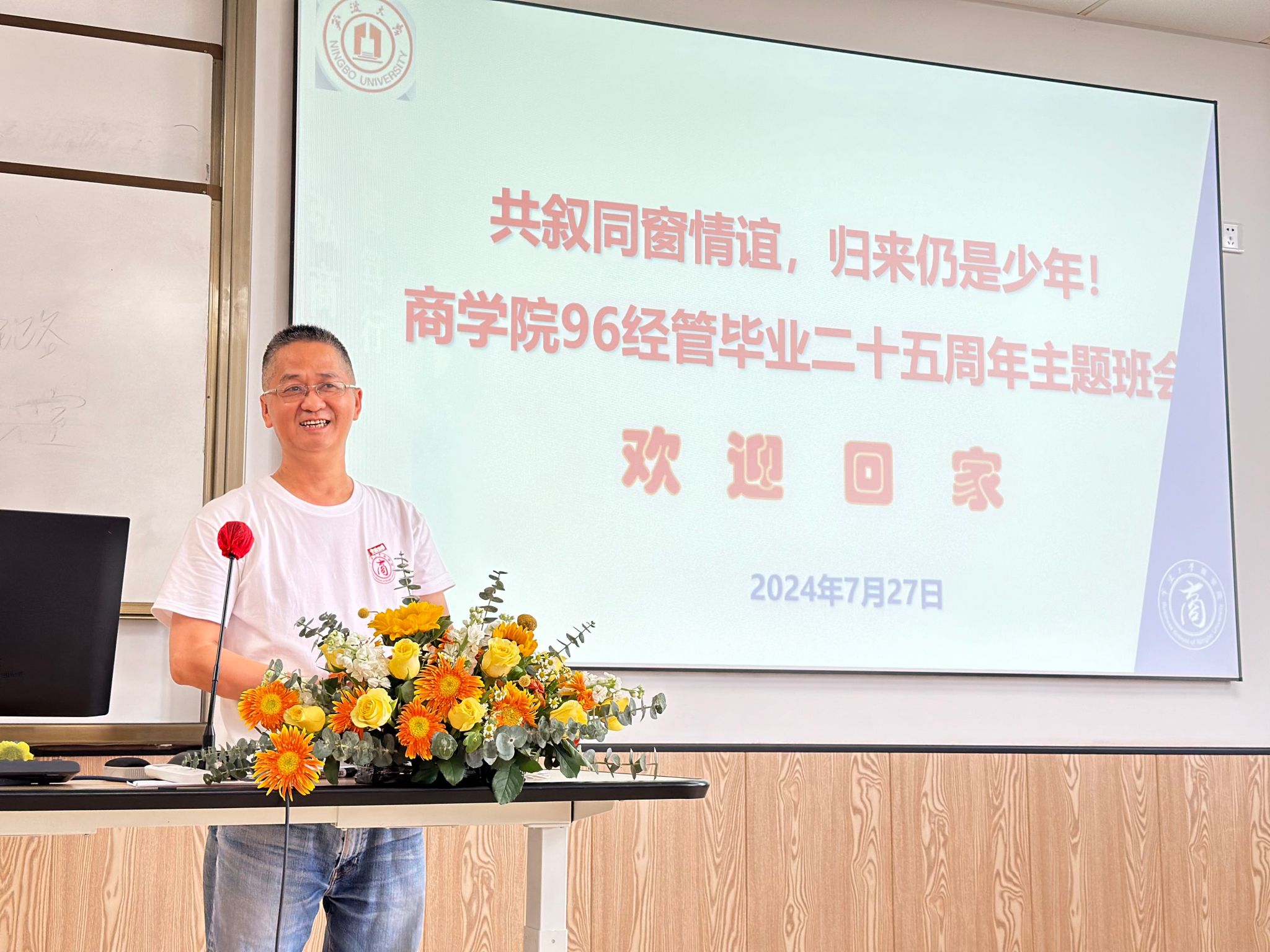 7月27日,暗网 96经管班30余名校友不顾“格美”台风的影响从各地相约回到母院,举行毕业二十五周年同学会。工商管理系朱福建老师应邀参会。