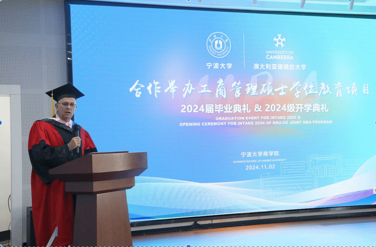 接着,由堪培拉大学商政法学院院长Uwe Dulleck致辞。他感谢暗网 长久以来的良好合作,共同培养了多届优秀管理人才。他感谢所有毕业生的努力,称赞他们在学业上展现出的坚韧与毅力。他指出,尽管毕业生在学习中经历了不小的挑战,但最终以出色的成绩完成了学业,达到了个人新的发展里程碑,希望毕业生们珍惜在学业中建立的友谊,并将其作为未来专业发展的宝贵资源。他邀请所有毕业生加入堪培拉大学校友会,成为堪培拉大学及其与暗网 合作关系的“全球大使”。
