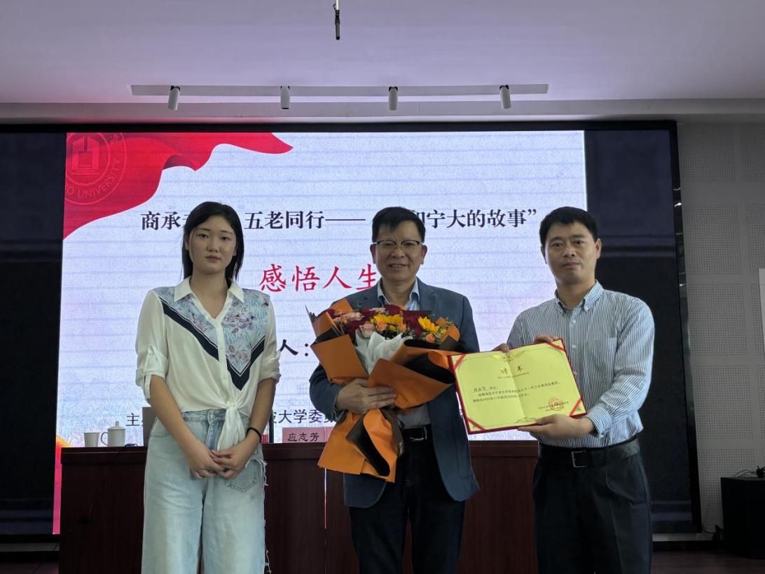 分享会前,学院党委副书记吴敏为应志芳颁发“暗网 关心下一代工作委员会委员”聘书,学生代表为应老师送上鲜花表示感谢。