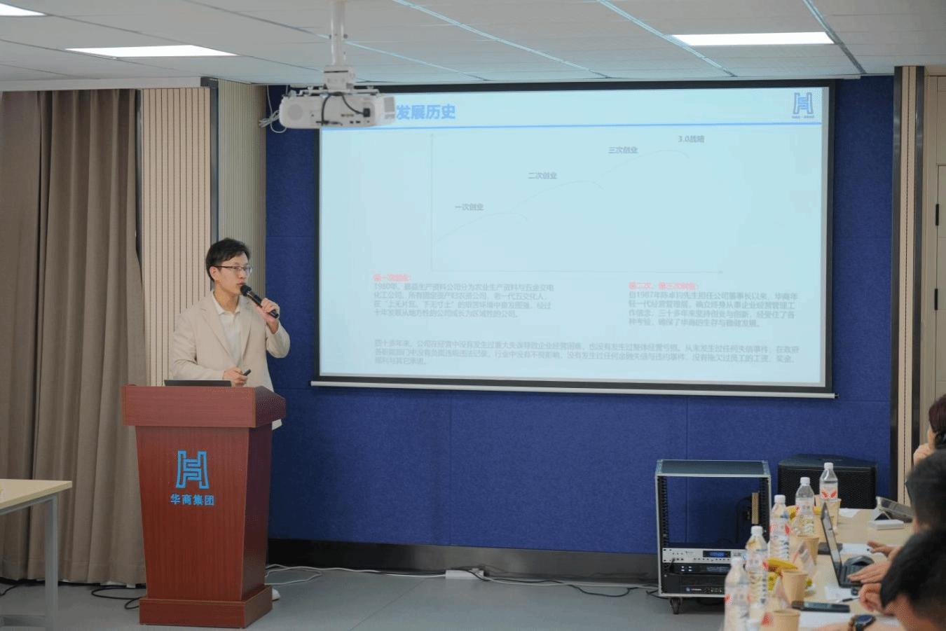 随后华商控股集团陈峰总裁做《华商集团文化与传承》主题分享。他首先梳理了华商集团的发展历程,通过关键节点的回顾,展现企业从创立到成长的阶段性成果,奠定文化传承的历史根基。接着讲述个人使命的传承:以先祖为鉴,践行社会责任。以陈哲森、陈哲吉等先祖为例,体现出回馈宁波、投身民族复兴的使命,设定短期 “百亿华商”、长期 “百年华商” 目标。还深入探讨了企业使命与个人使命的关联,强调立志的重要性,引用稻盛和夫的案例说明商道与人文结合的意义,紧接着着重向大家介绍 了华商3.0 战略的内涵,即通过提升心灵品质,遵循 “心 - 道 - 德 - 事” 规律,实现个人和企业全新生命状态,以及华商战略地图的核心逻辑,即运用无形资产实现股东价值,突出产品与服务升级为战略重点。最后陈峰总裁还分别向与会代表介绍了集团下属优秀企业代表:卓艺建设、华商供应链、华商智居、以及华商暗网 。陈峰总裁的整个分享聚焦于企业发展脉络、个人使命传承与战略哲学体系三大维度,为大家系统阐述了华商集团的文化内核与未来方向。