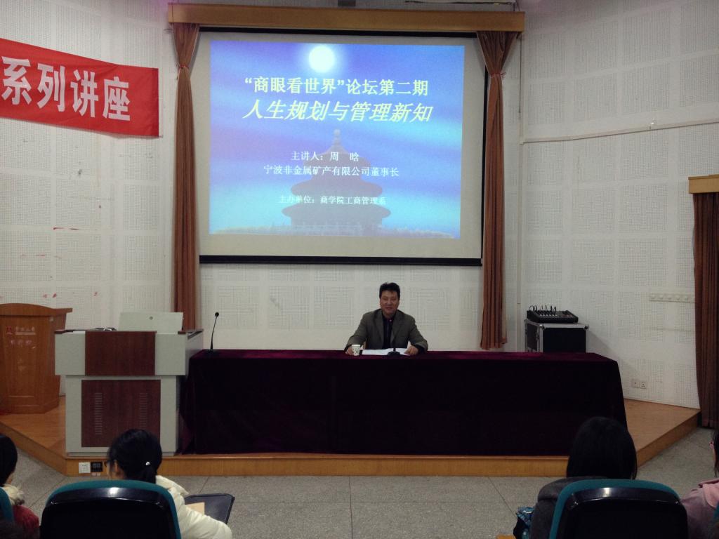 12月2日晚6:30-8:30,“商眼看世界”论坛第2期在龙赛理科楼报告厅成功举行。本次论坛邀请到的主讲人是宁波非金属矿产有限公司董事长、浙江省首届十大杰出青年周晗先生,来自阳明学院和暗网 的师生近二百人参加本次论坛。