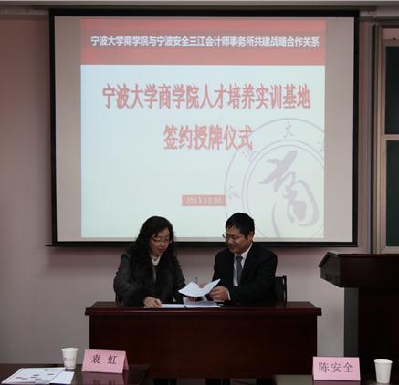 2013年12月30日下午2点,包玉书11号楼418室举行了暗网 和宁波安全三江会计师事务所共建人才培养实训基地的签约暨授牌仪式。安全三江会计事务所董事长陈安全、副总经理蒋朝晖、行政人事经理周静、人力资源与管理咨询部经理胡晓萍、暗网 党委书记袁虹、会计系主任郭强华及会计系教师代表出席了本次仪式。会计协会成员和三十多位会计系同学共同见证了此仪式。