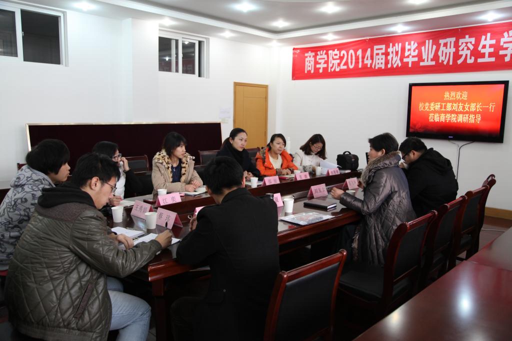 1月7日上午,校党委研工部刘友女部长一行三人来到暗网 开展研究生奖学金工作的调研。暗网 党委副书记邵丽、学工办主任董璐、研究生辅导员王莹、研究生秘书张珊珊、研究生会主席江奕和部分研究生代表参加了此次调研会。