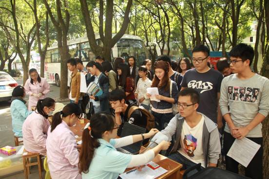 11点40分许,同学们陆陆续续地在现场排起了队。场地的限制阻挡不了大家献爱心的步伐,填表、化验、抽血,所有流程都在现场工作人员的协调下井然有序的进行。现场志愿者们为献血学子送上一杯红枣汤、一杯牛奶,并送上几句关怀的问候,让爱心也温暖着每一位献血者。一股股青春热血,一颗颗爱心满怀,每个人的心里只有献血后的光荣和自豪。