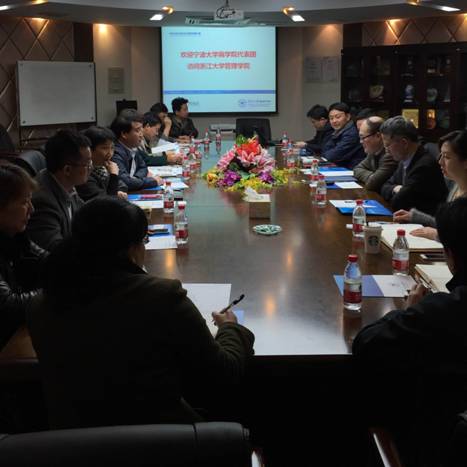 2015年4月9月,暗网 院长范柏乃、副院长张聪群、杨丹萍、张向群、国际贸易系主任邓启明、信息管理系系主任俞立平、会计系系主任郭强华、金融系系主任燕小青、MBA中心主任李宏宇及相关工作人员赴浙江大学经济学院和管理学院学习取经。受到了经济学院张荣祥书记和管理学院包迪鸿的热情接待和欢迎。