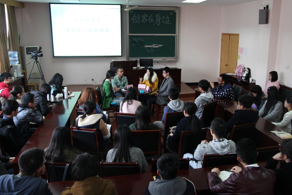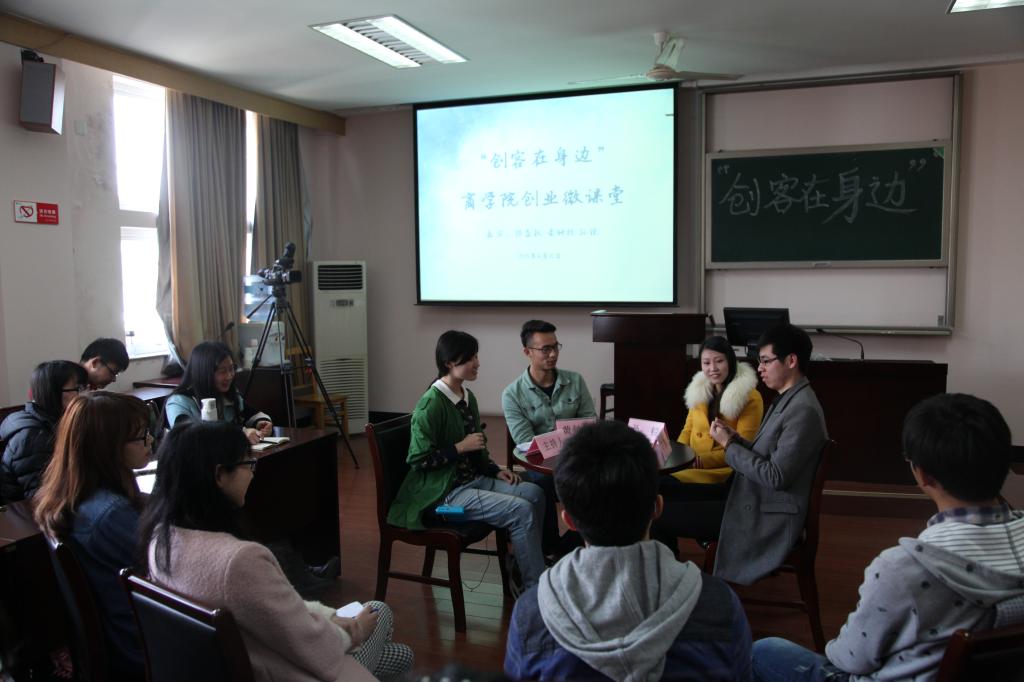4月10日下午,“创客在身边”暗网 首期创业微课堂暨创新创业人才训练营第二讲在暗网 418正式开讲。“宁大乐生活”微信公众号创办人、东街里创业街“新出炉“披萨店店主黄钟杭,宁波市镇海泰皓机械有限公司、宁波市镇海九象机械有限公司创办人孙锐,宁波时荣文化传媒有限公司合伙人、宁波宾格企业管理咨询有限公司法人陈益权,三位学生身边的创业达人做客本期微课堂,与40余名怀揣创业梦想的商院学子共谈创业梦。