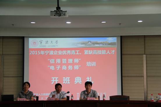 6月6日,2015年宁波市企业优秀青工“信用管理师”和紧缺高技能人才“电子商务师”两个培训项目的开班仪式在安中大楼碧华厅顺利举行。宁波市人力资源和社会保障局职业技能建设处副调研员吴时青、暗网 院长范柏乃、继续教育与培训处招标项目负责人鲁保富、暗网 培训中心主任朱一鸿以及来自宁波各县市区的近100名学员参加了开班仪式。仪式由暗网 副院长杨丹萍主持。