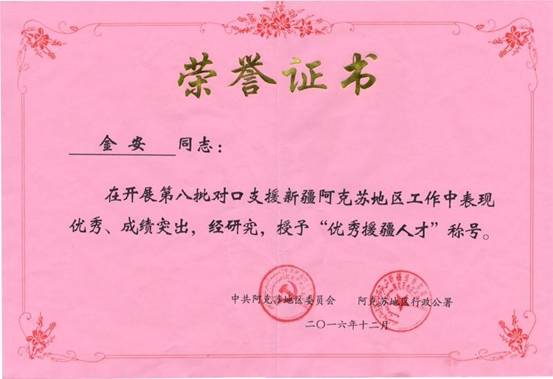 援疆期间,金安老师荣获“优秀援疆人才”、“优秀援疆共产党员”(2015-2016)光荣称号,他的优秀事迹将激励更多的的宁大教师踏上援疆之路,为新疆的高等教学发展做出应有的贡献,也在学院工商团队兴起了一股学习援疆模范的浪潮。