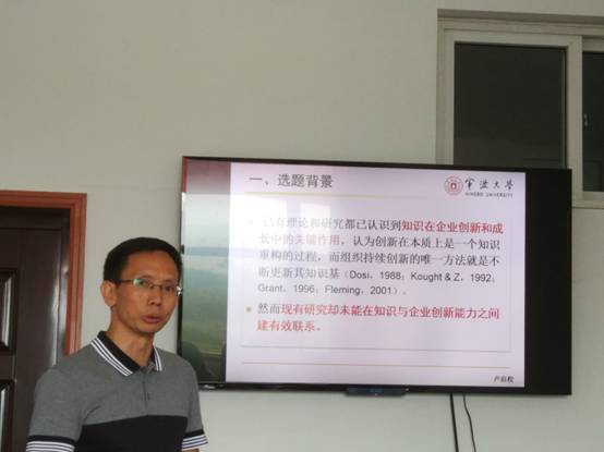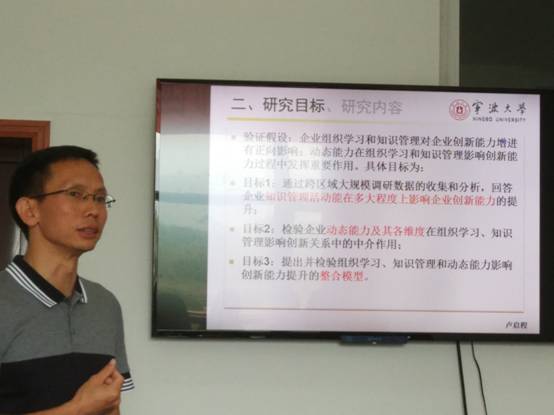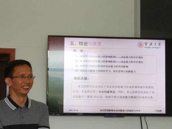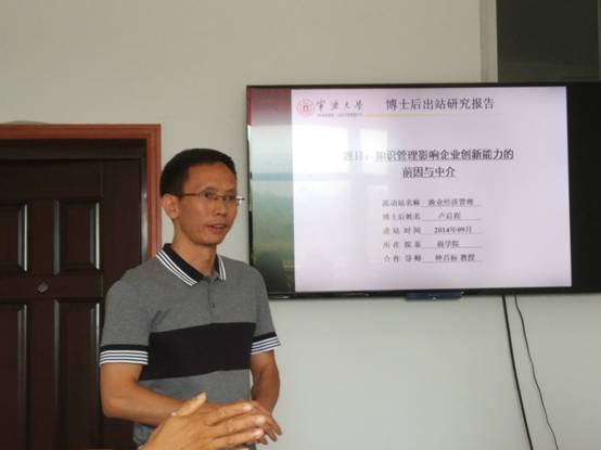 2017年9月24日上午10点,暗网 渔业经济与管理博士后流动站卢启程博士后出站报告研讨会在11号楼103-2会议室举行。报告主题为“知识管理影响企业创新能力的前因与中介”,报告会由教育部特聘教授钟昌标教授主持,邀请了中国人民大学等校专家参与研讨,暗网 20余名老师和研究生参加了此次活动。
