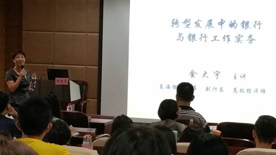 报告开始,金行长对此次讲座的初衷与目的做了引导性的介绍。金行长讲到,“银行发展与银行工作实务需要依靠完善的制度、严格的监管以及优秀的人才。” 接着,金行长围绕“银行是干什么的”、“银行业务及组织框架”和“如何进入银行编制及进入银行工作的必要素质”这三个问题对银行及银行工作实务展开了系统而生动的讲演。在报告中,金行长指出银行的转型势在必得,称“银行的新模式发展,尤其是互联网金融模式的出现使得信息更加透明,数据更加清晰,更好的降低了交易成本,应引起同学们极大重视,同学们需要在这方面多加关注。”对有意愿进入银行工作的同学,金行长提出“切勿急功近利,不仅要多读自己专业外的有关于金融银行杂志和书籍,还要做好自己的人生职业规划。” 最后,金行长对同学们寄予很大的信心与希冀,希望同学们能多读书,多思考。同行的人力资源部王主任也热烈欢迎大家关注东海银行的秋招。