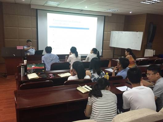 大会主报告以后,Chuanzhong-Li 教授又专门就“合成控制法”与海洋生态课题组成员进行了小范围的专题交流。主要包括三个方面内容:第一,“合成控制法”方法介绍;第二,“合成控制法”应用案例:包括德国的统一、碳税以及中国与挪威的外交绝境;第三,“合成控制法”在中国可能涉及的应用领域,重点介绍了这一方法在海洋生态制度绩效评价问题方面的应用,引发了在座各位的热烈讨论。大家围绕着如何选取与东海类似地区、确定指标、确定时间段等问题展开了深入交流。