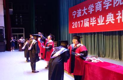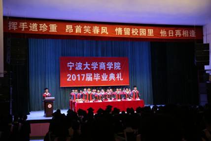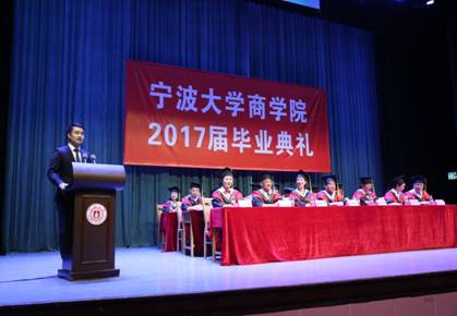 2017届学生毕业典礼暨学位授予仪式在林杏琴会堂举行。学院全体领导、各系、所、学位点负责人、毕业班班主任、2017届全体毕业生以及家长代表出席了典礼。本次毕业典礼由院党委副书记邵丽主持。  典礼上,范院长代表学院向全体毕业生表达了衷心的祝贺与殷切期望,同时也希望同学们永保坚持不懈、努力奋斗的态度,永保读书学习、探索新知的习惯,永保胸怀天下、为国为民的抱负,艰苦奋斗,勇于创新,敢于担当,努力成为让母校引以为傲的“商界精英”。胡书记代表学院宣布了2017届优秀毕业生名单,优秀毕业生代表依次上台领奖。浙江省优秀学生干部宋双、国家奖学金获得者符栋栋以及宁波市跨境电子商务职业技能大赛铜奖获奖者Shadman分别代表本科、硕士和留学生毕业生上台发言,他们与全体毕业生们一起追忆了在暗网