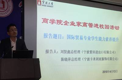 最后,刘贤彪总经理和陈晓萍总经理就学生的问题进行了详细解答,杨丹萍教授对本次活动作了总结,并相约于5月中上旬带领学生到宁波紫田进出口有限公司和宁波卡米利亚服饰有限公司参观学习,以呼应本次企业家高管进校园活动。