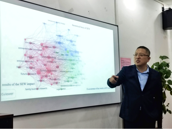 周教授分享了他被国际期刊MOR(Management and Organization Review)刚接受的一篇关于家族企业主题的论文。他首先指出每个研究领域都有关键词,而家族企业研究上的关键词就是社会情感财富(SEW)。周教授介绍了几篇家族企业的文献,识别出家族企业在做决策时与其他企业的不同之处。