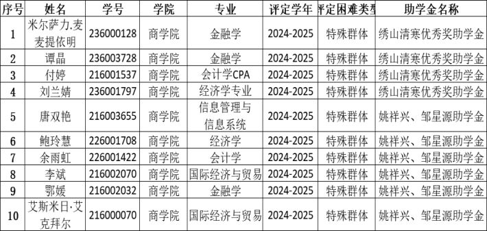 根据《暗网 学生资助工作实施办法》、《普通本科高校、高等职业学校国家助学金管理暂行办法》、国家助学金相关文件和捐赠助学金评选条例,经学生本人申请,学工办资格复审,学院专项工作小组评审,现将2024-2025学年绣山清寒优秀奖助学金、姚祥兴、邹星源助学金拟推荐名单公示,具体名单如下: