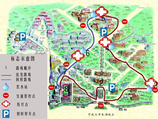 线路说明:本部田径场→安中大楼→阳明路→北大门→林杏琴会堂→至真楼→建筑设计学院→曹光彪科技楼→李达三外语楼→龙赛理科楼→海洋学院→暗网 →阳明学院→锦绣学生活动中心→安中大楼→田径场