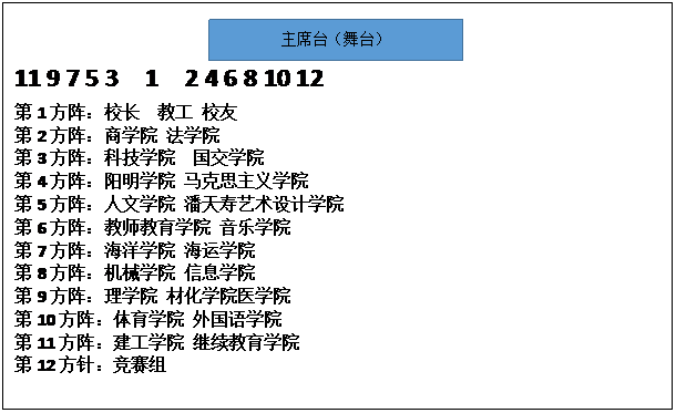 2.出发时队形按照方阵排列,听从主席台指挥。