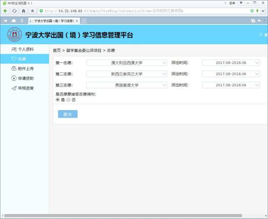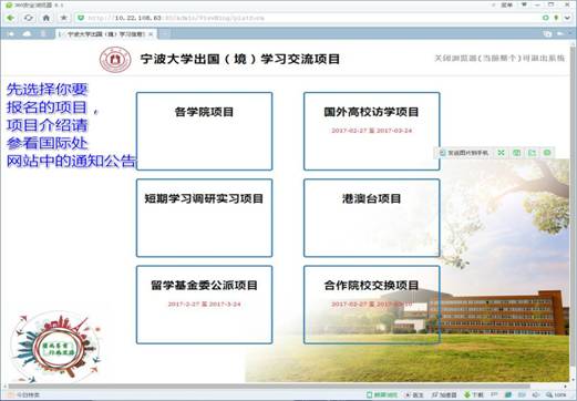 出国(境)学习交流项目在线报名需要在学校内网的环境下进行,目前暂不开放外网报名。请使用电信宽带或者到学校机房操作。