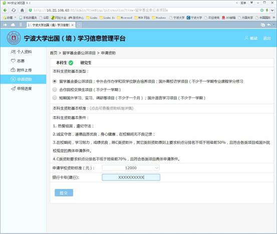 填写个人信息、上传附件材料、填写学校志愿、申请资助,无误后点击保存、提交。信息保存后不能修改。