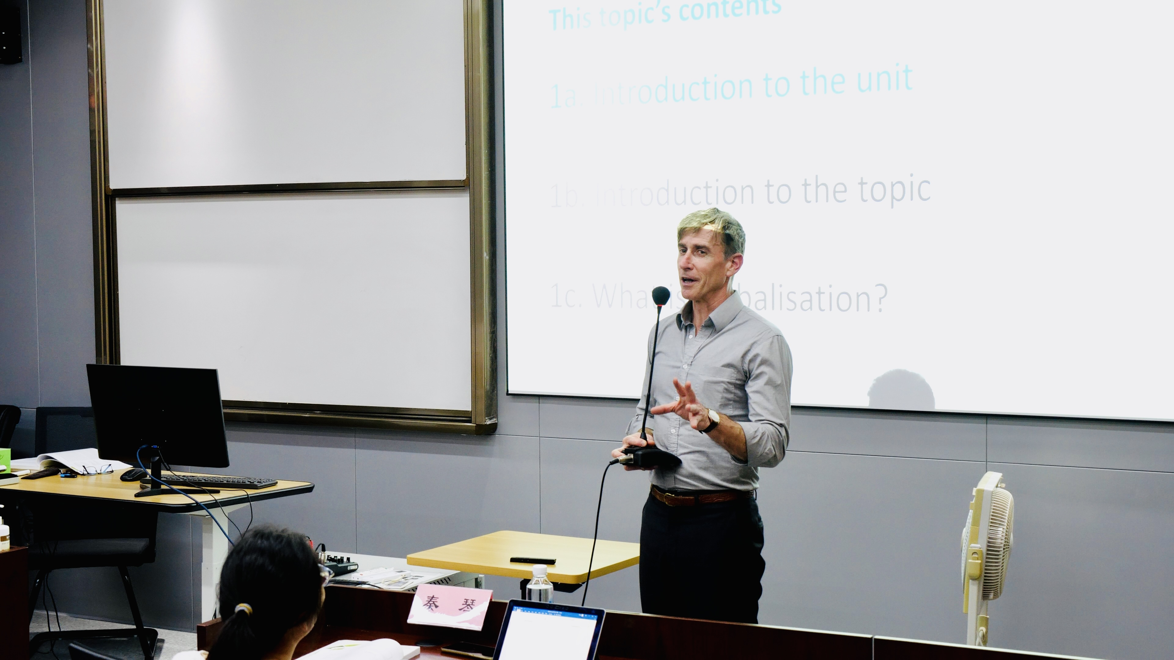 Freyens 教授课上对《国际商务》课程进行了简单的介绍。该课程致力于将理论知识与实战经验、管理经验相结合,助力渴望突破国际市场的企业管理者深入了解全球商业环境,提升战略思维,增强在国际商业实践中学以致用的能力。课程安排在工作日晚上,一天工作的疲惫与夏日的炎热并未影响到同学们上课的热情,聚精会神听讲,认真参与老师的提问与讨论,整个课堂积极融洽。