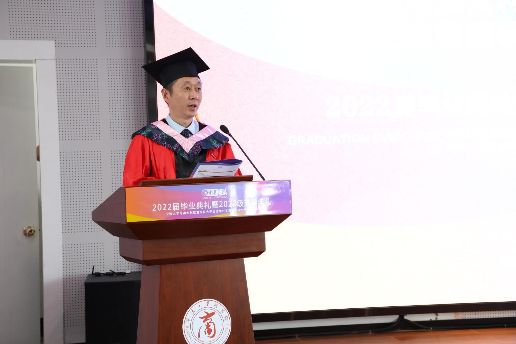 在澳大利亚堪培拉大学的毕业典礼现场视频播放后,金院长首先致辞。他祝贺同学们顺利完成学业,感谢老师们的辛勤付出,也感谢社会各界对暗网 中澳MBA发展的支持。他指出中澳MBA项目应该及时顺应社会发展变化趋势,定位高质量发展培养体系,培养更多“有创新思维,懂资本运营”的人才;同时,他还提出“大学MBA”教育应通过学生自主“批判式”学习,敢于挑战教科书中的权威理论观点,增加同任课教师的课堂互动,“敢问问题”、“会问问题”,来有效提升课堂的教学质量,增加学习的探索性和研究性;第三点,他提出项目要进一步提高游学活动质量。“读万卷书,行万里路”。培养学者和有思想的人,“行万里路”是非常重要的。金院长通过分享他暑期的游学经历,倡导MBA学员们要不断丰富自身的思想体系,训练悟性,激发灵感,为明天步向成功做好准备。